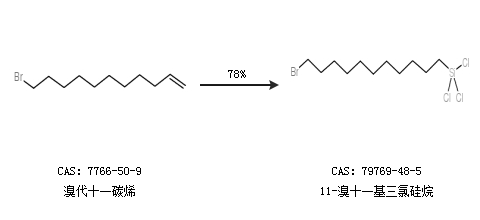 1.通过溴代十一碳烯合成11-溴十一基三氯硅烷,收率约78%;