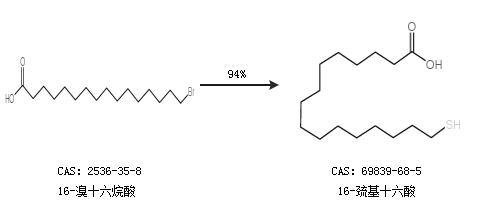 1.通过16-溴十六烷酸合成16-巯基十六酸,收率约94%;