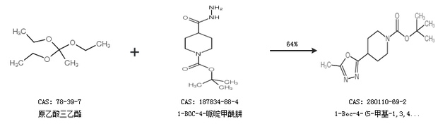 2.通过原乙酸三乙酯和1-BOC-4-哌啶甲酰肼合成1-Boc-4-(5-甲基-1,3,4-噁二唑-2-基)哌啶,收率约64%;