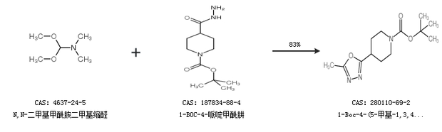 1.通过N,N-二甲基甲酰胺二甲基缩醛和1-BOC-4-哌啶甲酰肼合成1-Boc-4-(5-甲基-1,3,4-噁二唑-2-基)哌啶,收率约83%;