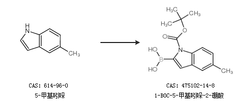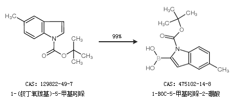 1.通过1-(叔丁氧羰基)-5-甲基吲哚合成1-BOC-5-甲基吲哚-2-硼酸,收率约99%;