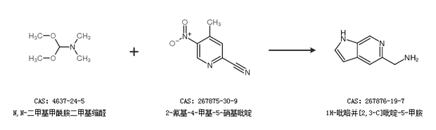 1.通过N,N-二甲基甲酰胺二甲基缩醛和2-氰基-4-甲基-5-硝基吡啶合成1H-吡咯并[2,3-C]吡啶-5-甲胺