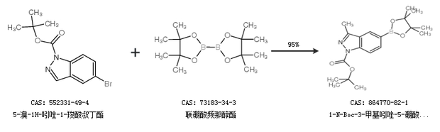 1.通过5-溴-1H-吲唑-1-羧酸叔丁酯和联硼酸频那醇酯合成1-N-Boc-3-甲基吲唑-5-硼酸频那醇酯,收率约95%;