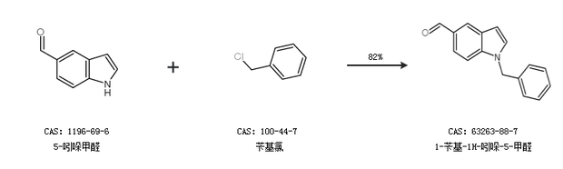 2.通过5-吲哚甲醛和苄基氯合成1-苄基-1H-吲哚-5-甲醛,收率约82%;
