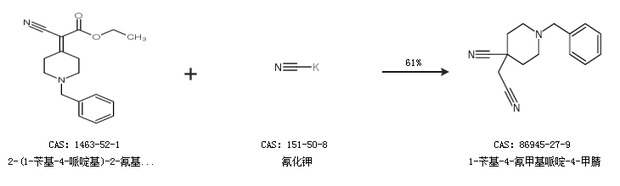 1.通过2-(1-苄基-4-哌啶基)-2-氰基乙酸乙酯和氰化钾合成1-苄基-4-氰甲基哌啶-4-甲腈,收率约61%;