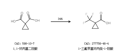 1.通过1,1-环丙基二羧酸合成1-三氟甲基环丙烷-1-羧酸,收率约34%;