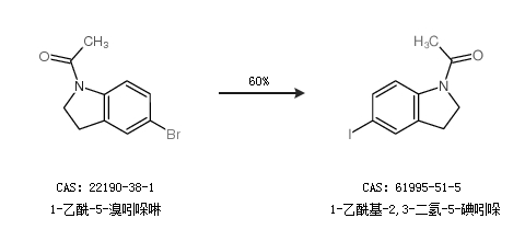 1.通过1-乙酰-5-溴吲哚啉合成1-乙酰基-2,3-二氢-5-碘吲哚,收率约60%;