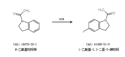2.通过N-乙酰基吲哚啉合成1-乙酰基-2,3-二氢-5-碘吲哚,收率约83%;