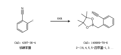 1.通过邻碘苯腈合成2-((4,4,5,5-四甲基-1,3,2-二噁硼烷-2-基)甲基)苯甲腈,收率约64%;