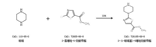 1.通过哌嗪和2-氯噻唑-5-羧酸甲酯合成2-(1-哌嗪基)-5噻唑羧酸甲酯,收率约33%;
