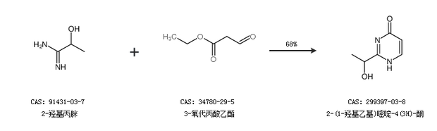 1.通过2-羟基丙脒和3-氧代丙酸乙酯合成2-(1-羟基乙基)嘧啶-4(3H)-酮,收率约68%;