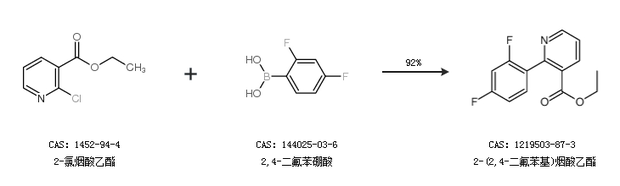 1.通过2-氯烟酸乙酯和2,4-二氟苯硼酸合成2-(2,4-二氟苯基)烟酸乙酯,收率约92%;