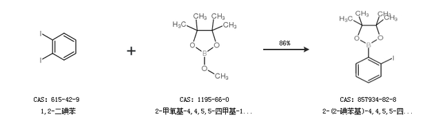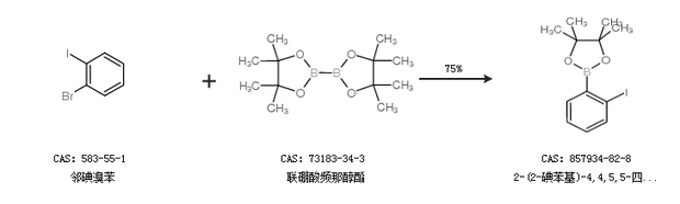 2.通过邻碘溴苯和联硼酸频那醇酯合成2-(2-碘苯基)-4,4,5,5-四甲基-1,3,2-二氧环戊硼烷,收率约75%;