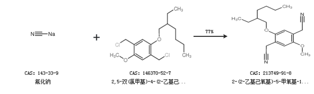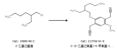 英文别名 2-(2-Ethylhexyloxy)-5-methoxy-1,4-benzenediacetonitrile;1,4-bis(cyanomethyl)-2-(2''-ethylhexyloxy)-5-methoxybenzene;2,5-bis(cyanomethyl)-4-(2-ethyl)hexyloxy-anisol;1,4-bis(cyanomethyl)-2-methoxy-5-(2''-ethylhexyloxy)benzene;Y8243;2,2''-(2-(2-Ethylhexyloxy)-5-methoxy-1,4-phenylene)diacetonitrile;
