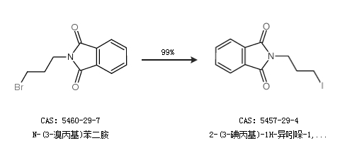 1.通过N-(3-溴丙基)苯二胺合成2-(3-碘丙基)-1H-异吲哚-1,3(2H)-二酮,收率约99%;