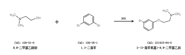 2.通过N,N-二甲基乙醇胺和1,3-二溴苯合成2-(3-溴苯氧基)-N,N-二甲基乙胺,收率约36%;