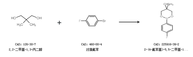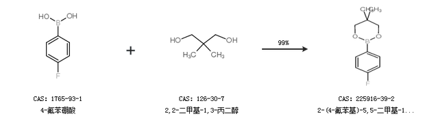1.通过4-氟苯硼酸和2,2-二甲基-1,3-丙二醇合成2-(4-氟苯基)-5,5-二甲基-1,3,2-二羟硼,收率约99%;