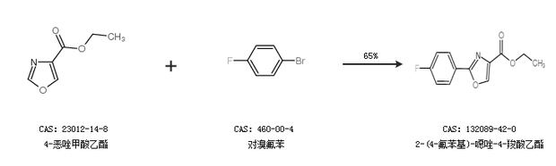 1.通过4-恶唑甲酸乙酯和对溴氟苯合成2-(4-氟苯基)-噁唑-4-羧酸乙酯,收率约65%;