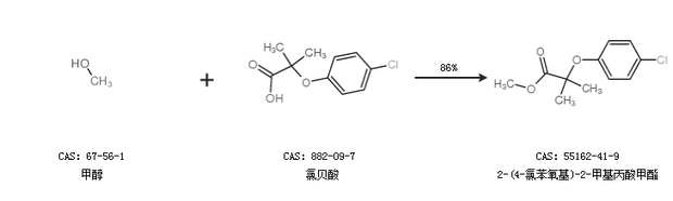1.通过甲醇和氯贝酸合成2-(4-氯苯氧基)-2-甲基丙酸甲酯,收率约86%;