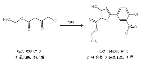 1.通过4-氯乙酰乙酸乙酯合成2-(4-羟基-3-硝基苯基)-4-甲基-5-噻唑甲酸乙酯,收率约38%;