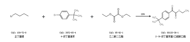 1.通过正丁基锂、4-叔丁基溴苯和乙二酸二乙酯合成2-(4-叔丁基苯基)乙醛酸乙酯,收率约28%;