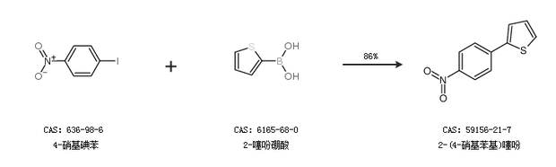 1.通过4-硝基碘苯和2-噻吩硼酸合成2-(4-硝基苯基)噻吩,收率约86%;