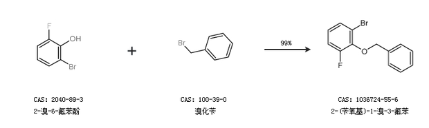 1.通过2-溴-6-氟苯酚和溴化苄合成2-(苄氧基)-1-溴-3-氟苯,收率约99%;