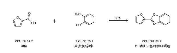 2.通过糠酸和美沙拉嗪杂质C合成2-(呋喃-2-基)苯并[d]噁唑,收率约67%;