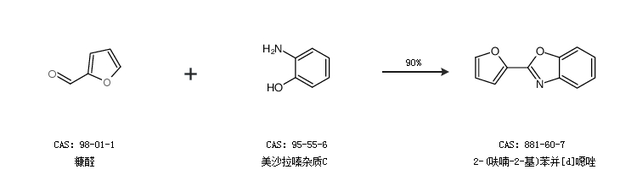 1.通过糠醛和美沙拉嗪杂质C合成2-(呋喃-2-基)苯并[d]噁唑,收率约90%;