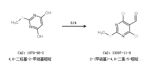 1.通过4,6-二羟基-2-甲巯基嘧啶合成2-(甲硫基)-4,6-二氯-5-嘧啶甲醛,收率约61%;