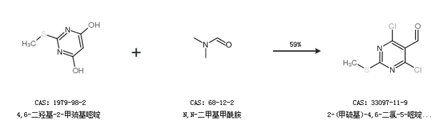 2.通过4,6-二羟基-2-甲巯基嘧啶和N,N-二甲基甲酰胺合成2-(甲硫基)-4,6-二氯-5-嘧啶甲醛,收率约59%;