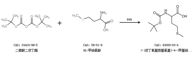 1.通过二碳酸二叔丁酯和DL-甲硫氨酸合成2-(叔丁氧基羰基氨基)-4-(甲基硫代)丁酸,收率约84%;