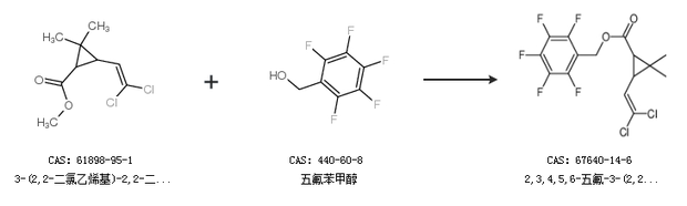 1.通过3-(2,2-二氯乙烯基)-2,2-二甲基环丙烷羧酸甲酯和五氟苯甲醇合成2,3,4,5,6-五氟-3-(2,2-二氯乙烯基)-2,2-二甲基环丙烷羧酸苄酯