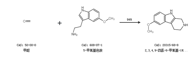 1.通过甲醛和5-甲氧基色胺合成2,3,4,9-四氢-6-甲氧基-1H-吡咯[3,4-B]吲哚,收率约94%;
