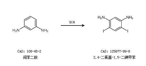 1.通过间苯二胺合成2,4-二氨基-1,5-二碘甲苯,收率约91%;