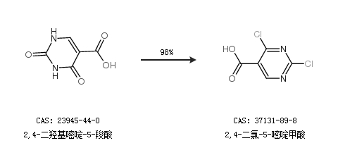 1.通过2,4-二羟基嘧啶-5-羧酸合成2,4-二氯-5-嘧啶甲酸,收率约98%;