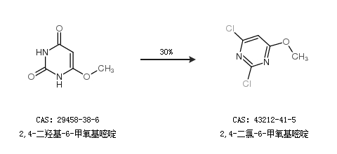 1.通过2,4-二羟基-6-甲氧基嘧啶合成2,4-二氯-6-甲氧基嘧啶,收率约30%;