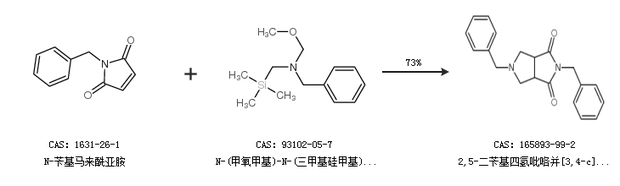 1.通过N-苄基马来酰亚胺和N-(甲氧甲基)-N-(三甲基硅甲基)苄胺合成2,5-二苄基四氢吡咯并[3,4-c]吡咯-1,3-二酮,收率约73%;