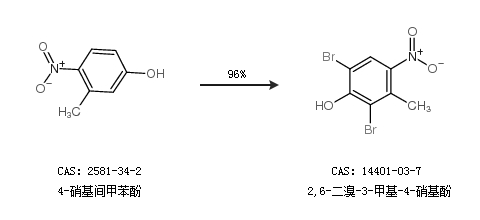 1.通过4-硝基间甲苯酚合成2,6-二溴-3-甲基-4-硝基酚,收率约96%;