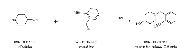 1.通过4-羟基哌啶和2-氰基溴苄合成2-[(4-羟基-1-哌啶基)甲基]苯腈,收率约84%;