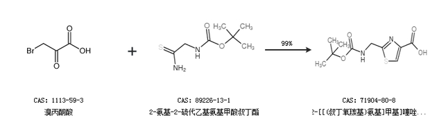 2.通过溴丙酮酸和2-氨基-2-硫代乙基氨基甲酸叔丁酯合成2-[[(叔丁氧羰基)氨基]甲基]噻唑-4-羧酸,收率约99%;