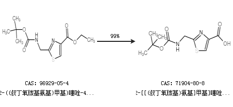 1.通过2-((叔丁氧羰基氨基)甲基)噻唑-4-甲酸乙酯合成2-[[(叔丁氧羰基)氨基]甲基]噻唑-4-羧酸,收率约99%;