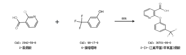 2.通过2-氯烟酸和6-溴喹喔啉合成2-[3-(三氟甲基)苯氧基]烟酸,收率约88%;