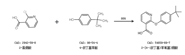 1.通过2-氯烟酸和4-叔丁基苯酚合成2-[4-(叔丁基)苯氧基]烟酸,收率约88%;