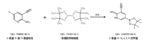 1.通过2-氨基-5-溴-3-腈基吡啶和联硼酸频那醇酯合成2-氨基-5-(4,4,5,5-四甲基-1,3,2-二噁硼烷-2-基)吡啶-3-甲腈,收率约67%;