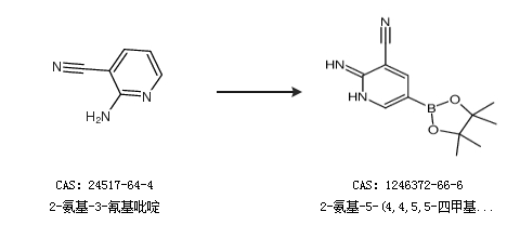 2.通过2-氨基-3-氰基吡啶合成2-氨基-5-(4,4,5,5-四甲基-1,3,2-二噁硼烷-2-基)吡啶-3-甲腈