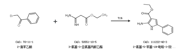 2.通过2-溴苯乙酮和3-氨基-3-亚氨基丙酸乙酯合成2-氨基-5-苯基-1H-吡咯-3-羧酸乙酯,收率约71%;