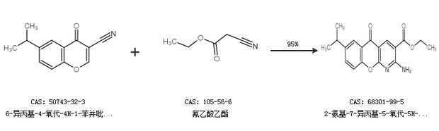 1.通过6-异丙基-4-氧代-4H-1-苯并吡喃-3-甲腈和氰乙酸乙酯合成2-氨基-7-异丙基-5-氧代-5H-[1]苯并吡喃[2,3-b]吡啶-3-羧酸乙酯,收率约95%;