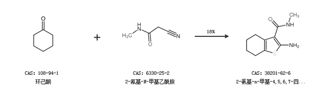 1.通过环己酮和2-氰基-N-甲基乙酰胺合成2-氨基-n-甲基-4,5,6,7-四氢-1-苯并噻吩-3-羧酰胺,收率约18%;