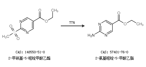 1.通过2-甲砜基-5-嘧啶甲酸乙酯合成2-氨基嘧啶-5-甲酸乙脂,收率约77%;